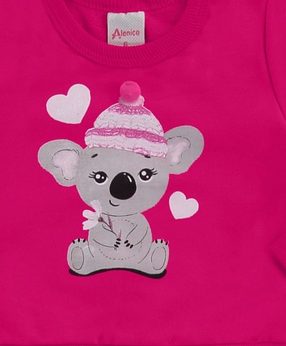 Conjunto Alenice blusão em moletom felpado na cor pink com estampa frontal de coala com aplique em pom pom no chapeu e acabamento em punho. Calça saia em molecotton felpado na cor pink com tule sobreposta e elastico no cós. Todo delicado o conjunto traz estampa com pompom aplicado que além de permitir interação traz informação de moda. A calça com saia tule é destaque no look das meninas mais charmosas. (Composição: Blusão - 100% algodão; calça - Dianteiro/traseiro 92% algodão , 13% poliéster e 5% elastano. Sobreposição 100% poliéster.)