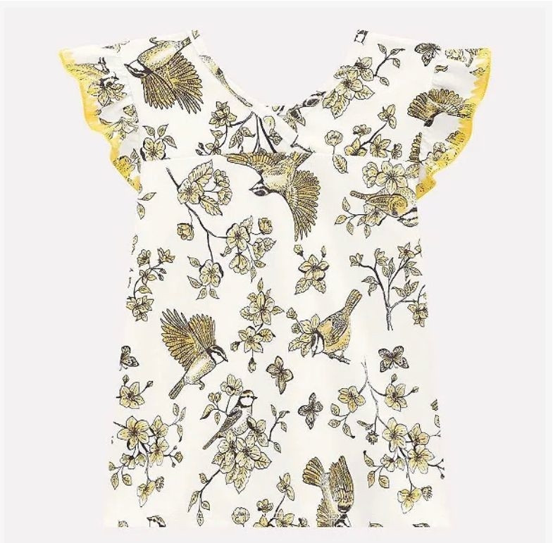 Essa linda blusa da marca Milon é confeccionada em Meia Malha, na cor off white, gola redonda na frente e em V nas costas, manga estilo princesa com croche em toda a volta, estampa rotativa na cor mostarda de passáros e flores, aplique em flor em tule na parte superior, modelagem estilo bata.