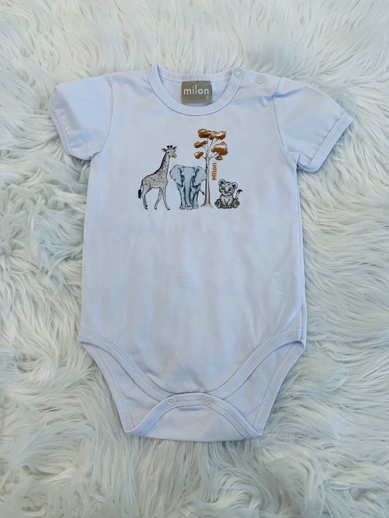 Esse lindo body da marca Milon é confeccionada em Cotton na cor branca, com modelagem tradicional, gola redonda, estampa frontal de animais da savana africana (girafa, leão e elefante), possui aberturas de ombro e entrepernas por botões de pressão para facilitar a troca.