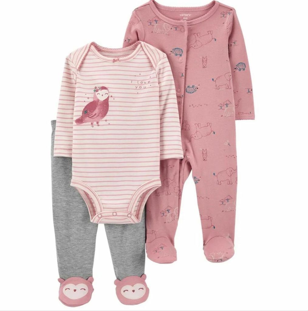 Este conjunto de 3 peças contém: 01 body manga longa branco com listra rosa e estampa de coruja na parte da frente, 01 calça cinza mescla com pés de coruja e um macacão rosa claro com pés e estampa de animais e corujas.