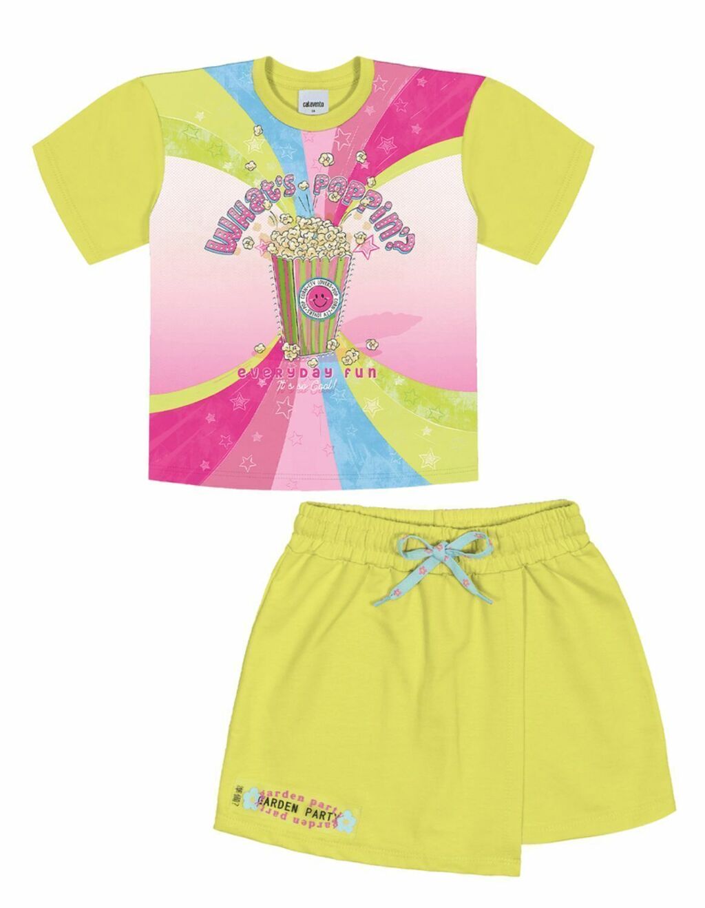 Conjunto blusa em moletinho malha, manga curta, gola redonda, possui estampa frontal com apliques em strass, short saia em malha com amarração na cintura com detalhes em flores que permite o ajuste, e etiqueta frontal com o tema da coleção jardim.