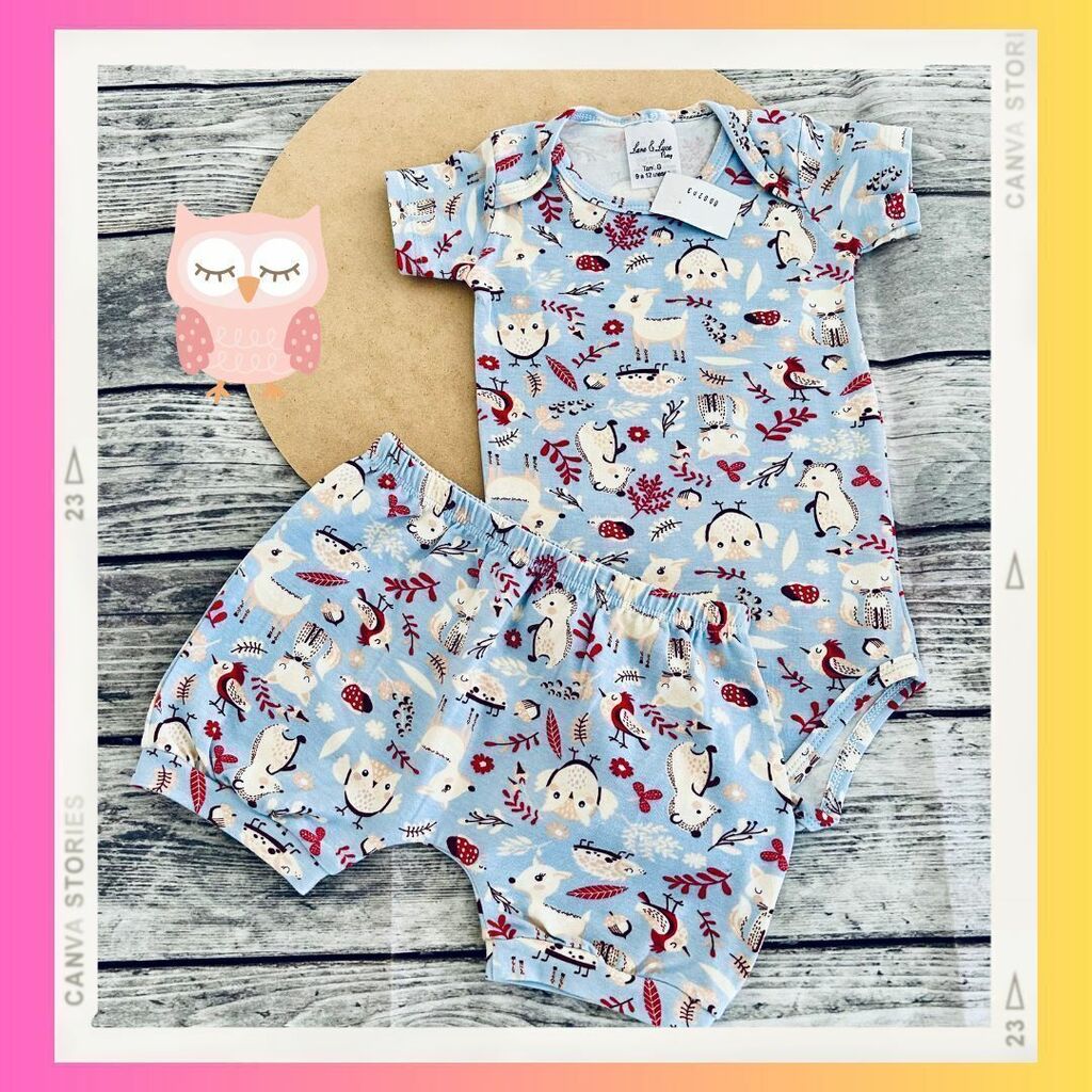 Esse lindo conjunto na cor azul claro com estampa rotativa de diversos animais, como por exemplo coruja, passaros, porco espinho, entre outros, super fresquinho e confortável, confeccionado em algodão, acompanha um body manga curta, gola redonda, botão entre pernas de pressão que facilita a troca e um short saruel da mesma estampa, com elastico na cintura e punho nas pernas.