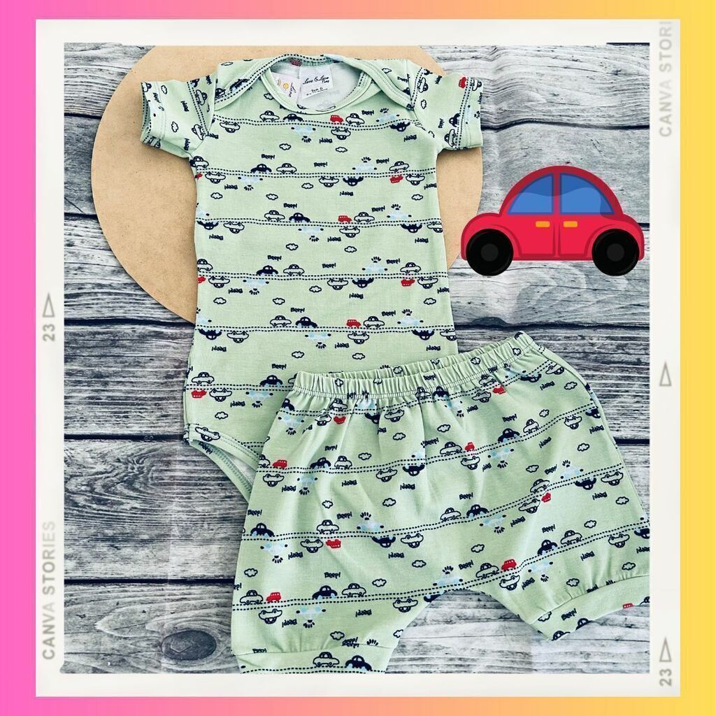 Esse lindo conjunto na cor verde com estampa rotativa de carrinhos em uma rodovia, super fresquinho e confortável, confeccionado em algodão, acompanha um body manga curta, gola redonda, botão entre pernas de pressão que facilita a troca e um short da mesma estampa, com elastico na cintura e punho nas pernas.
