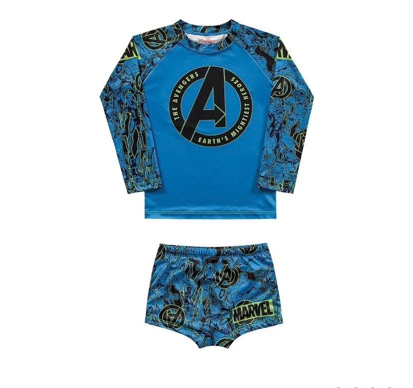 Conjunto camiseta manga longa e sunga Avengers para seu filho aproveitar na praia ou piscina com muito conforto e proteção UV (FPU) 50+. Modelo confeccionado em cotton azul, manga longa, decote redondo, estampa frontal com o simbolo Avenger em preto e verde neon, estampa rotativa nas mangas dos vingadores na mesma estampa da sunga, cadarço interno, costura contraste, modelagem ajustada.