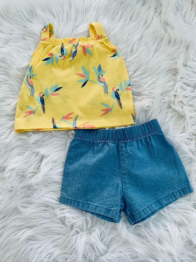 Este conjunto de 2 peças Carter´s contém 01 blusa na cor amarela, de alcinhas, com estampa de araras azuis e um short de tecido na cor jeans. Além disso, as costuras das peças são feitas pensando no conforto dos pequenos, não incomodando assim a pele dos bebês que são extremamente sensíveis.