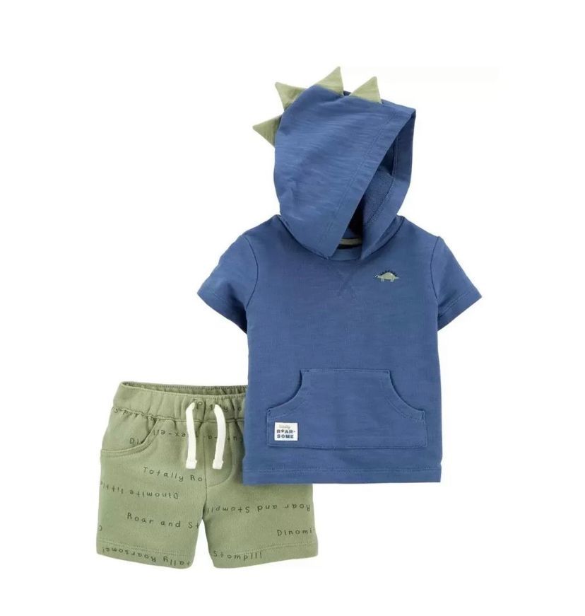 Este conjunto de 2 peças Carter´s super arrumadinho contém 01 camiseta manga longa azul com capuz, bordado frontal de Dinossauro e bolso canguru e um um shot verde com bolsos laterias com estampa rotativa. O chame desse conjunto está no capuz que possui escama de dinossauros.