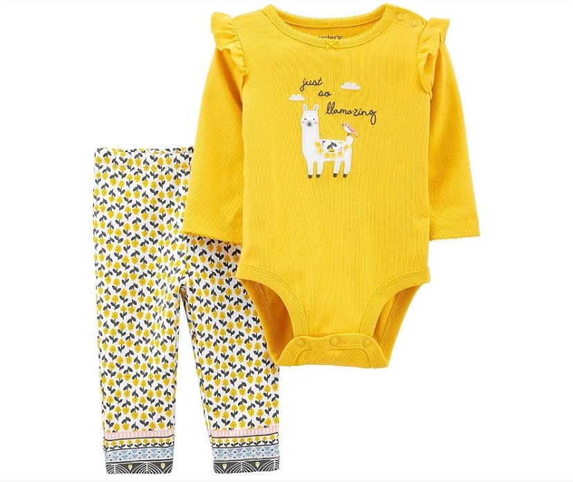 Esse lindo kit de 2 peças carter´s contem um body mostarda com aplique frontal de lhama e uma calça lfloral com detalhe nas pernas.