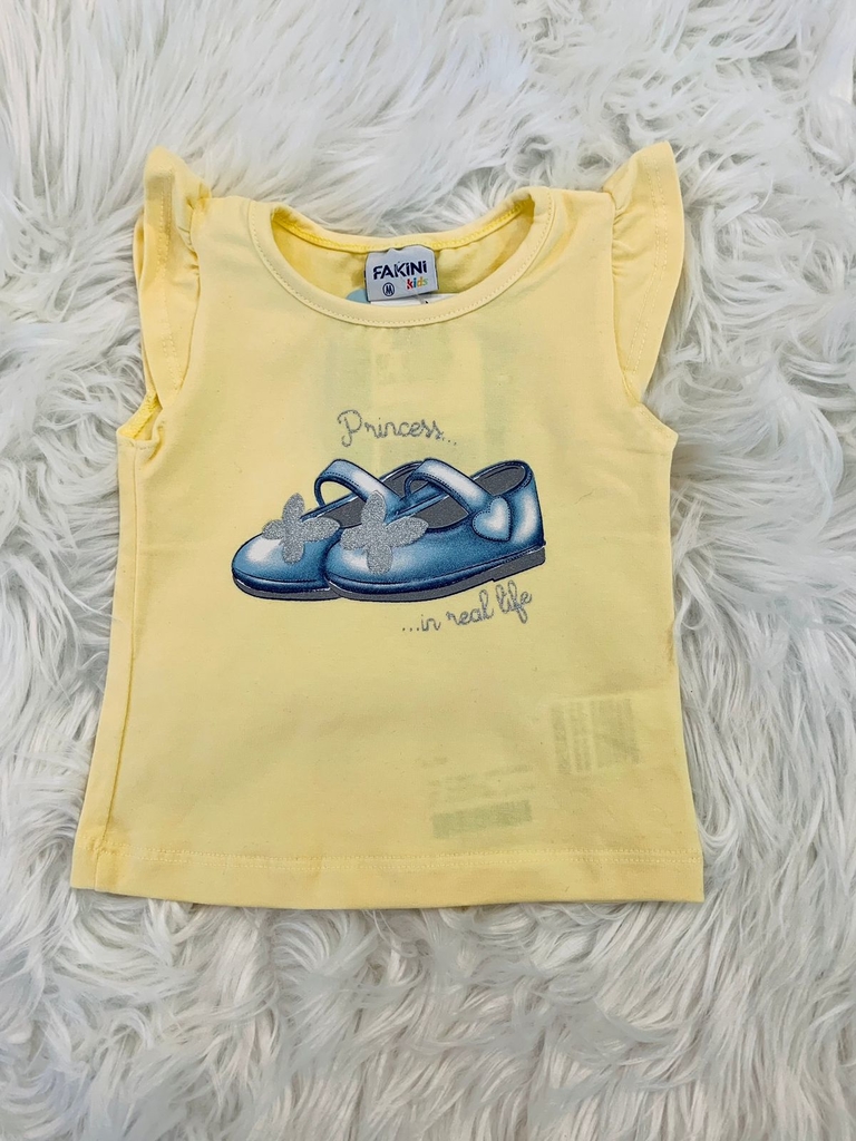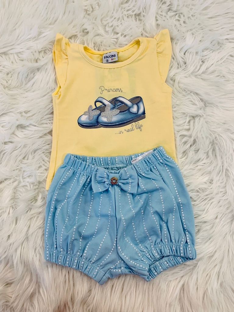 Este lindo conjunto da marca Fakini é composto por uma blusa amarela, gola redonda, manga fofa, com estampa frontal de sapatinho em tons de azul, escrita "princess in real life" em cinza prata e aplique em gliter e um short balonê azul com poá, laço na parte da frente com pingente e elastico nas pernas e cintura, o que faz com que o short fique ainda mais fofo. (Composição: Blusa: 92% algodão e 8% elastano; Short: 66% algodão, 32% poliester e 2% elastano).