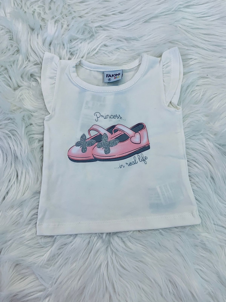 Este lindo conjunto da marca Fakini é composto por uma blusa off white, gola redonda, manga fofa, com estampa frontal de sapatinho em tons de rosa, escrita "princess in real life" em cinza prata e aplique em gliter e um short balonê rosa com poá, laço na parte da frente com pingente e elastico nas pernas e cintura, o que faz com que o short fique ainda mais fofo. (Composição: Blusa: 92% algodão e 8% elastano; Short: 66% algodão, 32% poliester e 2% elastano).