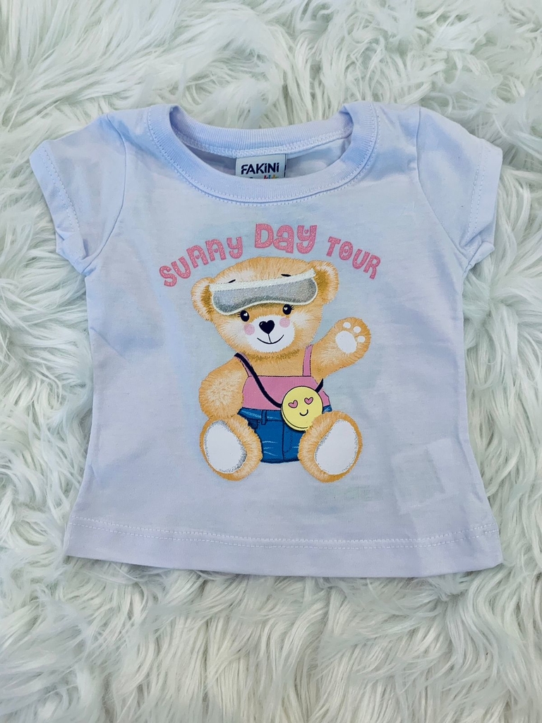 Este lindo conjunto da marca Fakini Kids é composto por uma Blusa branca, manga curta, gola redonda, com estampa frontal de urso com aplique em gliter e escrita "Surry Day Tour" em rosa e um short bem soltinho com elastico na cintura e de amarrar na parte da frente. (Composição: blusa 100% algodão; short - 92% viscose e 8% elastano ).