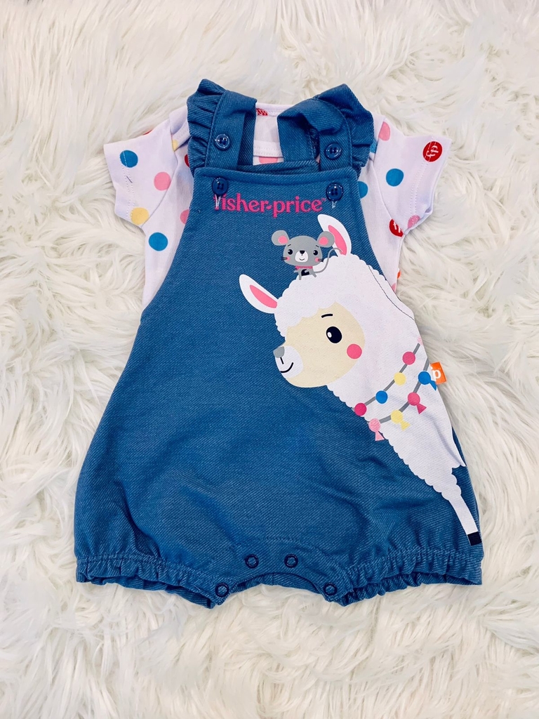 Este lindo conjunto da linha licenciada da Fakini, da Fisher Price, possui um body branco, manga curta, gola redonda, com bolas coloridas com a sigla "fp" (fisher price) nas bolas vermelhas, e uma linda jardineira em tecido, na cor azul jeans, estampa frontal lateral com a lhama e ratinha (figuras classicas da marca), botões nas alças que permite o ajustes na bebê, alças com babados e botões entre as pernas, que facilita a troca (composição: Jardineira - 66% algodão, 32% poliester e 2% de elastano; body - 100% algodão)