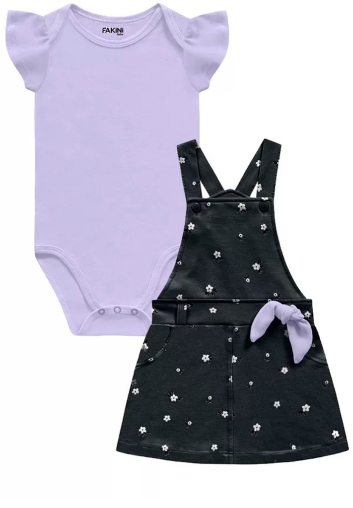 Este lindo conjunto da Fakini possui um body lindo na cor lilás, manga fofa, gola redonda, com botões de pressão entre as pernas e uma salopete, na cor asfalto (cinza escuro) com estampa rotativa de pequenas flores, com bolso falso na parte frontal, laço lilás da mesma cor do body na cintura, botões na parte superior que permite o ajuste nas criança (composição: body - 100% algodão; salopete - 66% algodão, 32% poliester e 2% elastano)