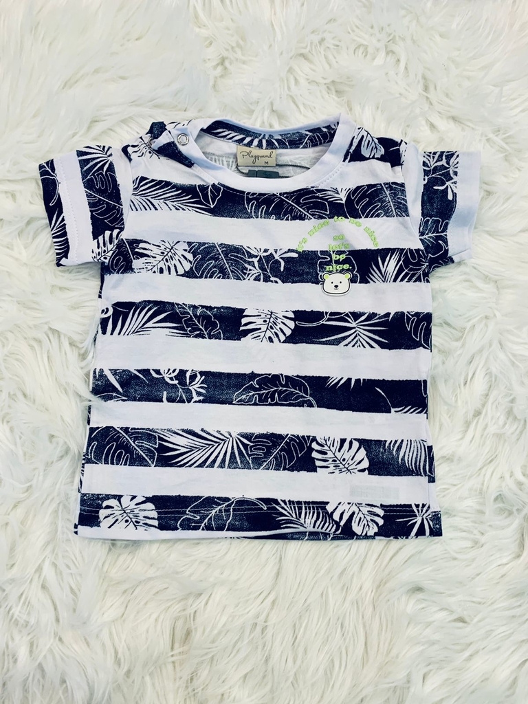 Este lindo conjunto da Fakini linha Playground acompanha uma camiseta manga curta, gola redonda com botão de pressão na parte dos ombros que facilita a troca, listrada de branco e azul com estampa de folhagem, com aplique de urso na parte da frente, e escrita it's nice to be nice e um short em tecido de viscose com elastano, mais arrumadinho, com falsa barguilha, elastico na cintura, e na parte das costas uma carinha de ursos bordada com orelhas dando um charme maravilhoso a esse lindo conjunto (Composição: short - 76% viscose, 20% poliamida e 4% elastano; camiseta - 100% algodão)