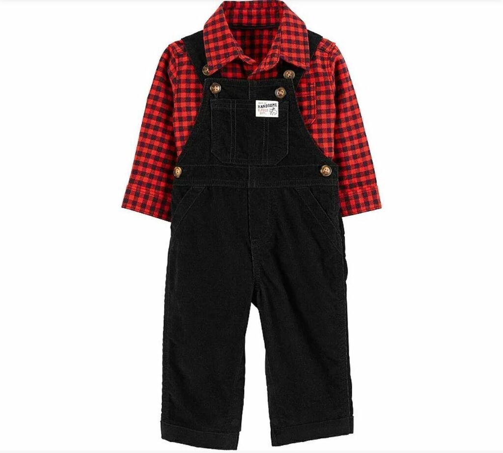 Este conjunto de 2 peças Carter´s super arrumadinho contém 01 camisa social xadrez em tom de vermelho e uma jardineira em veludo na cor preta, super elegante e estiloso. Seu principe ficará perfeito com esse conjunto.