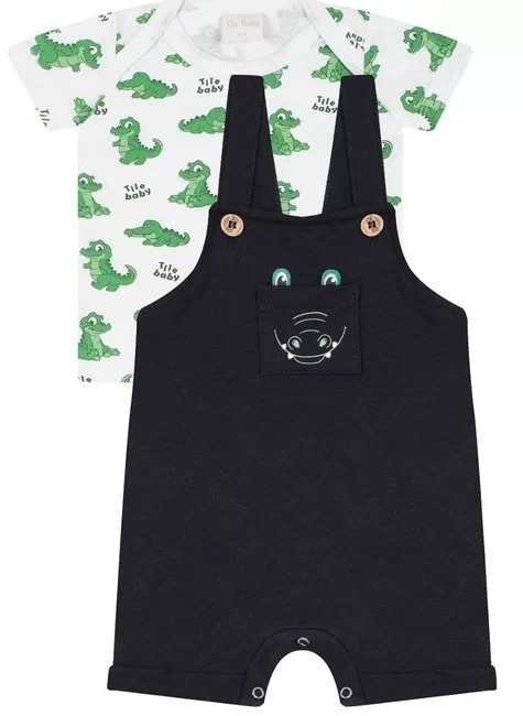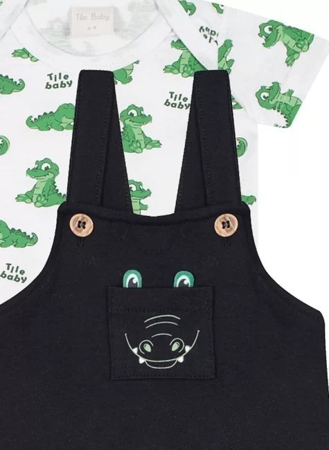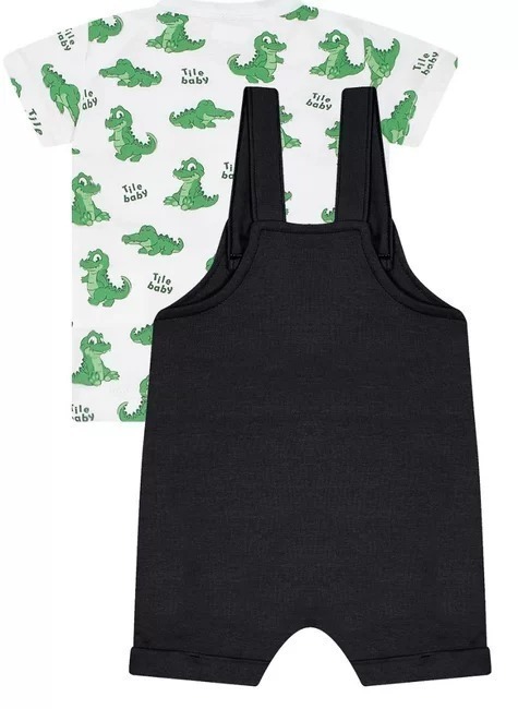 CONJUNTO JARDINEIRA EM SUEDINE E CAMISETA EM MEIA MALHA. Conjunto infantil masculino composto por uma camiseta e uma jardineira. A camiseta é confeccionada em malha de algodão, com estampa rotativa de jacaré, gola americana e manga curta. O charme desse conjunto esta na jardineira em suedine, cor lisa, com bolso frontal com a estampa da carinha do croocodilo, olhos interativos, botões frontais nas alças em madeira que permite o ajuste e botão entre pernas de pressão que facilita a troca.