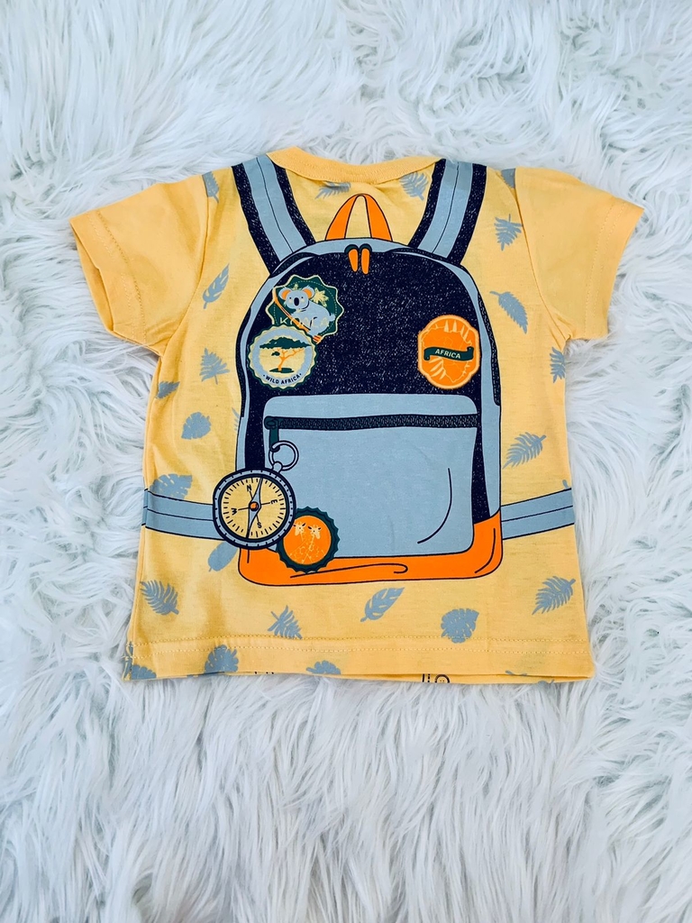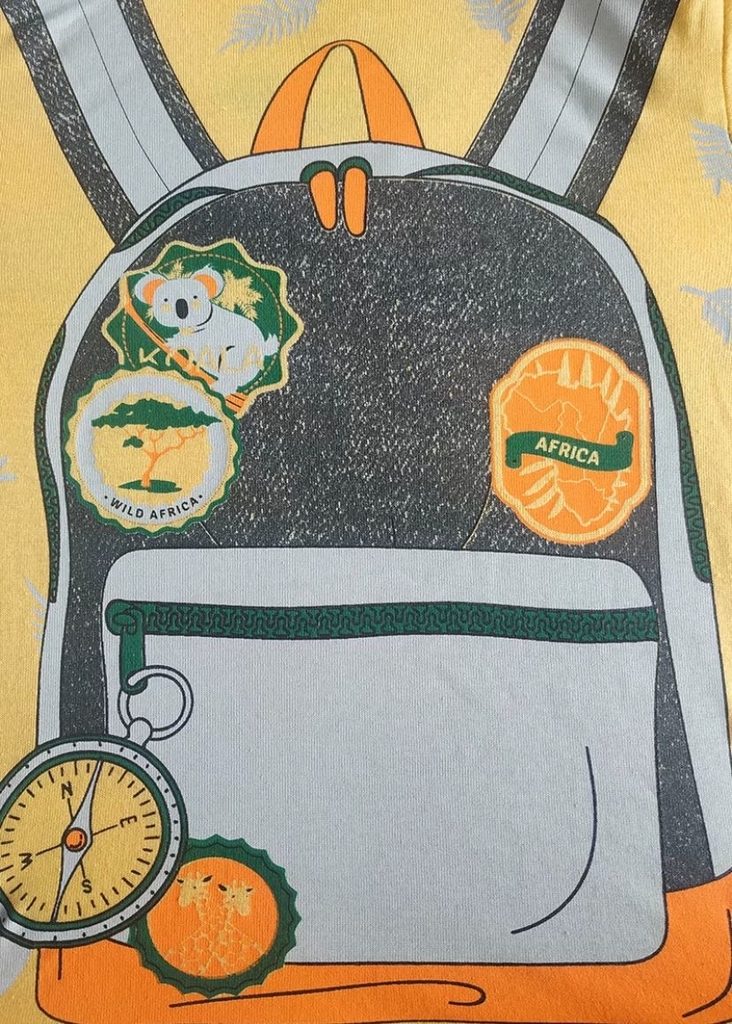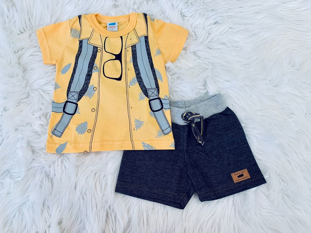 Este lindo conjunto da Marlan Baby acompanha uma camiseta mostarda, manga curta, gola redonda, com estampa frontal e nas costas como se a criança estivesse usando uma mochila escolar, com as alças na parte frontal com oculos e nas costas a mochila com bulsula, koala, giraffa e selos africanos e short de moletinho na cor jeans com elastico na cintura e cordão para amarrar que não permite ajuste (Composição: Camiseta - 100% algodão; Short - 54% algodão e 46% poliester)