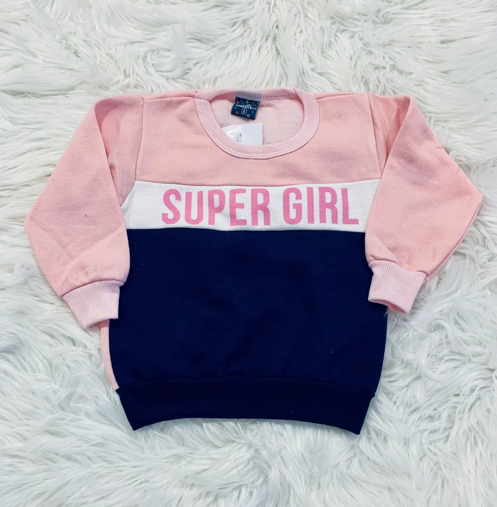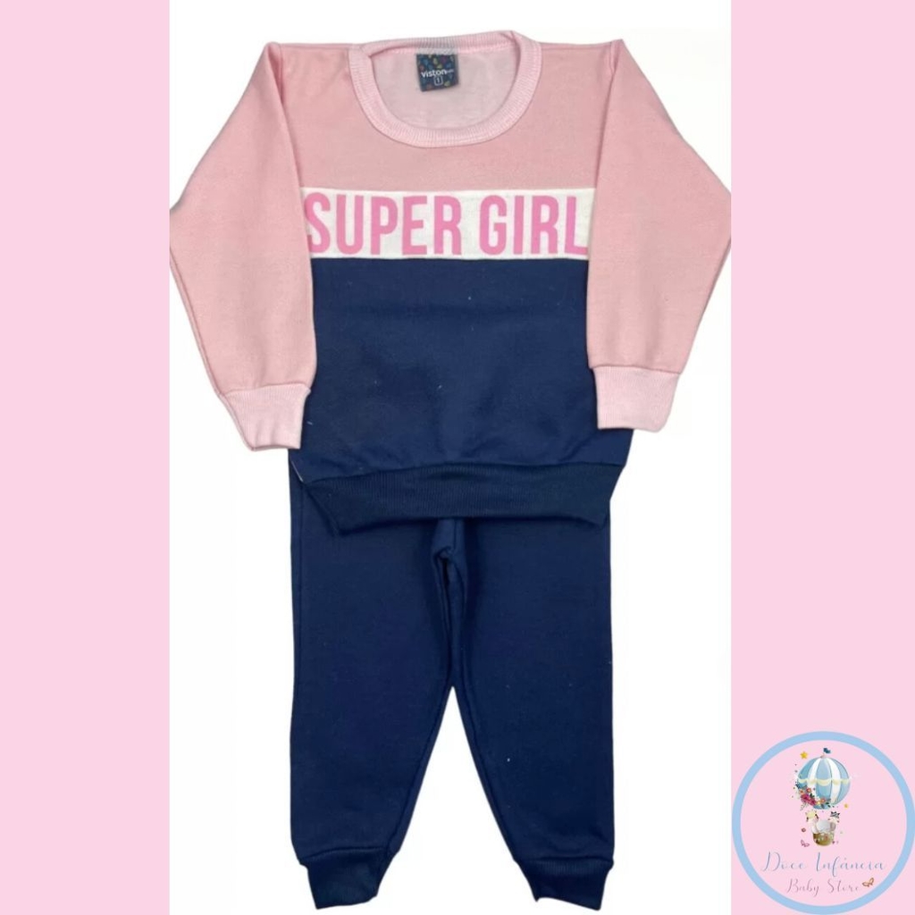Contém uma blusa em moletom peluciada com estampa frontal com a escrita Super Girl, gola Redonda, punhos em Ribana, e calça lisa em moletom peluciado, punhos em Ribana, com elástico na cintura. Fácil de vestir, facilitando assim o dia-a-dia das mamães e dos pequenos!