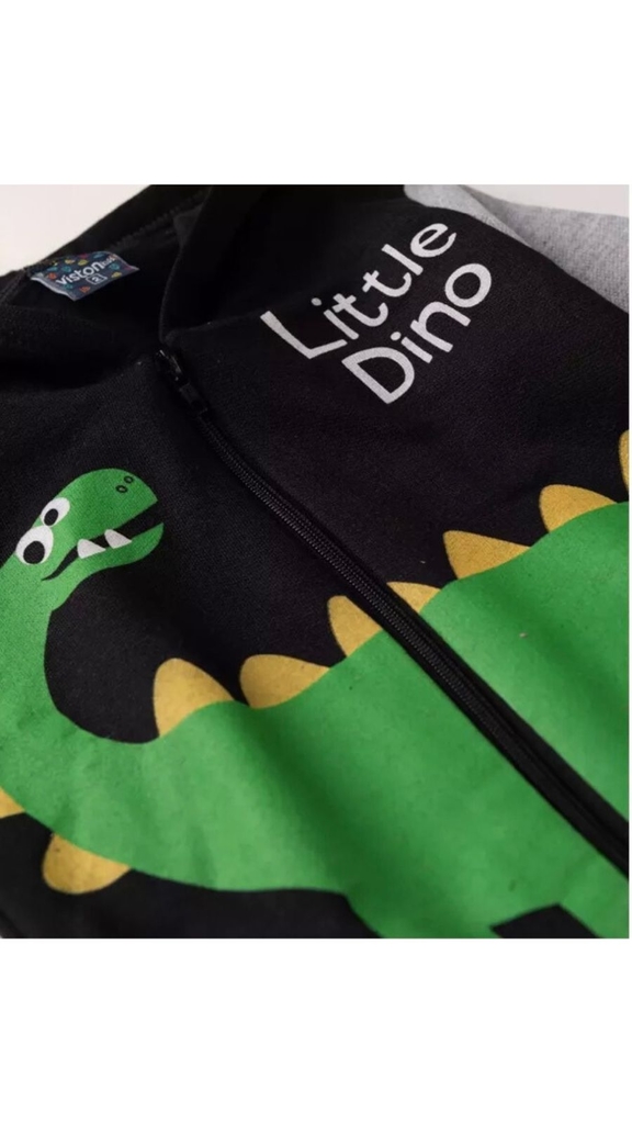 Contém uma jaqueta em moletom peluciada com capuz em silk com estampa de dinossauros, punhos em Ribana, manga em cor diferente do corpo do moletom e zíper frontal, e calça lisa em moletom peluciado, punhos em Ribana, com elástico na cintura. Fácil de vestir, facilitando assim o dia-a-dia das mamães e dos pequenos!