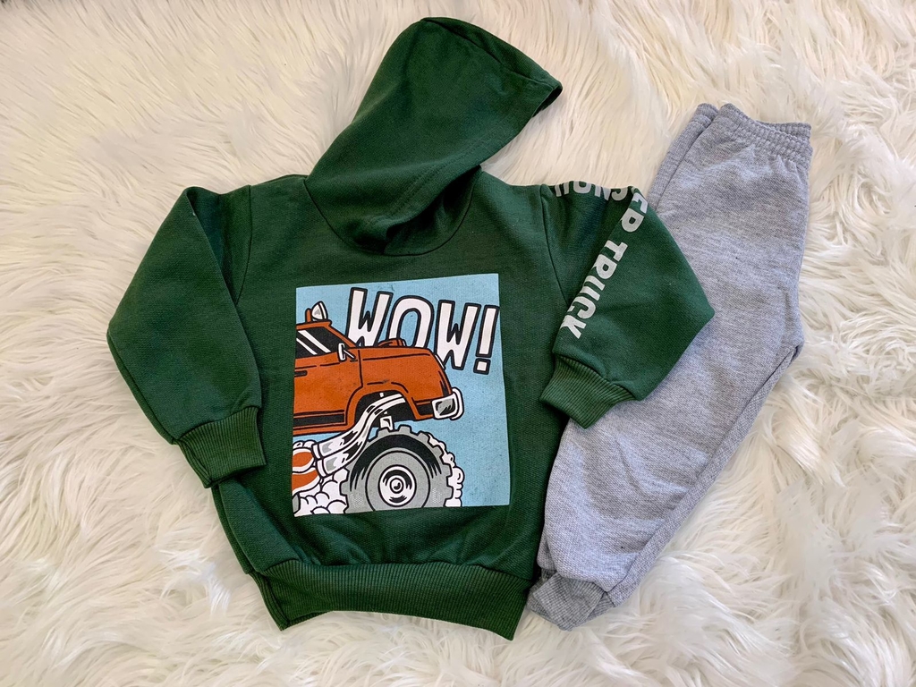 Contém um blusão em moletom peluciado com estampa frontal de Monster Truck na frente e escrita lateral na manga, gola Redonda, punhos em Ribana, e calça lisa em moletom peluciado, punhos em Ribana, com elástico na cintura. Fácil de vestir, facilitando assim o dia-a-dia das mamães e dos pequenos!