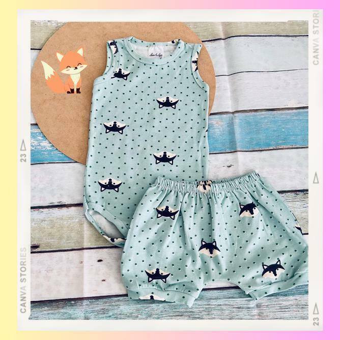 Esse lindo conjunto na cor verde agua com estampa rotativa de raposa, super fresquinho e confortável, confeccionado em algodão, acompanha um body regata, gola redonda, botão entre pernas de pressão que facilita a troca e um short saruel da mesma estampa, com elastico na cintura e punho nas pernas.