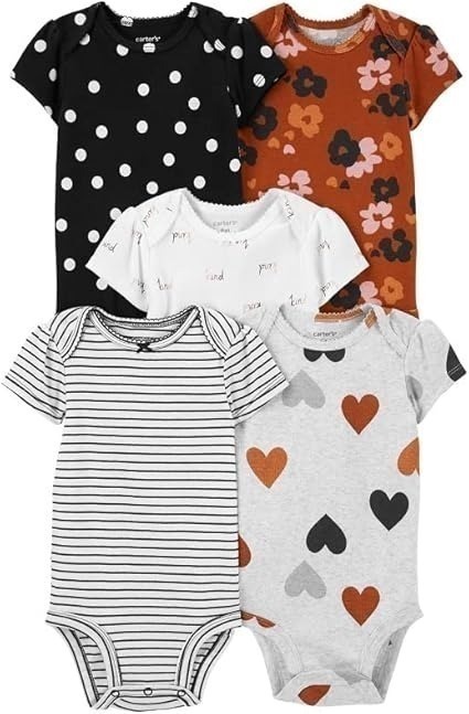 Este kit incrível contém 5 Bodys Carter's de manga curta, confeccionados em tecido de algodão suedine extremamente macio. Com uma variedade de cores e estampas adoráveis, este kit permite que as mamães criem diversos looks para seus pequenos, sem abrir mão do conforto característico da marca.