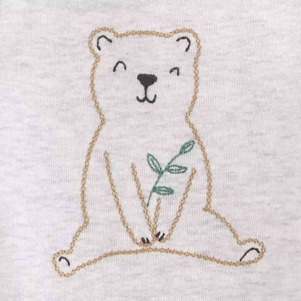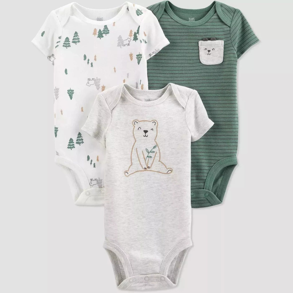 Esse Kit contém 3 Bodys Just One you by Carter's de manga curta, fabricados em tecido de algodão suedine extremamente macio. Com cores e estampas variadas (predominantemente nas cores cinza e verde, com estampa e bordados de urso) este kit oferece a possibilidade da mamãe formar diversos looks diferentes, além do conforto característico da marca.