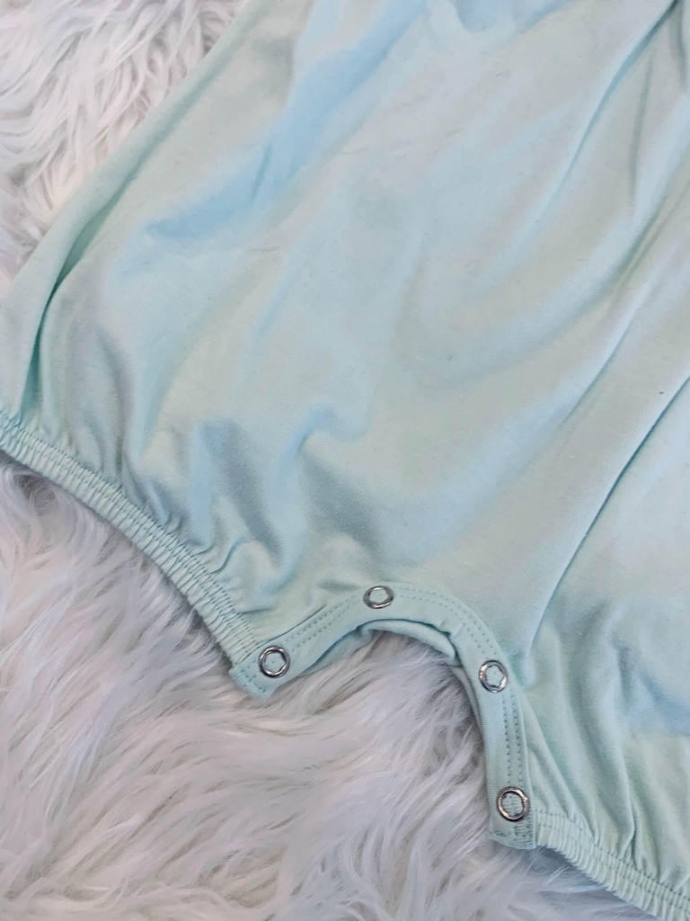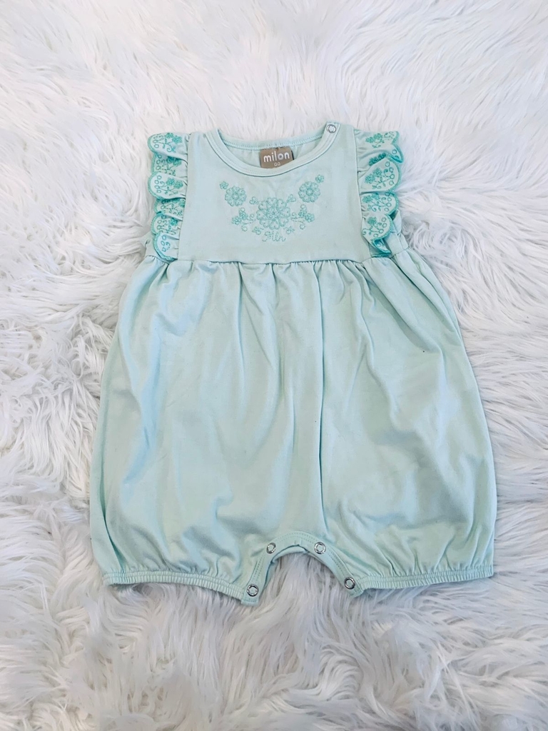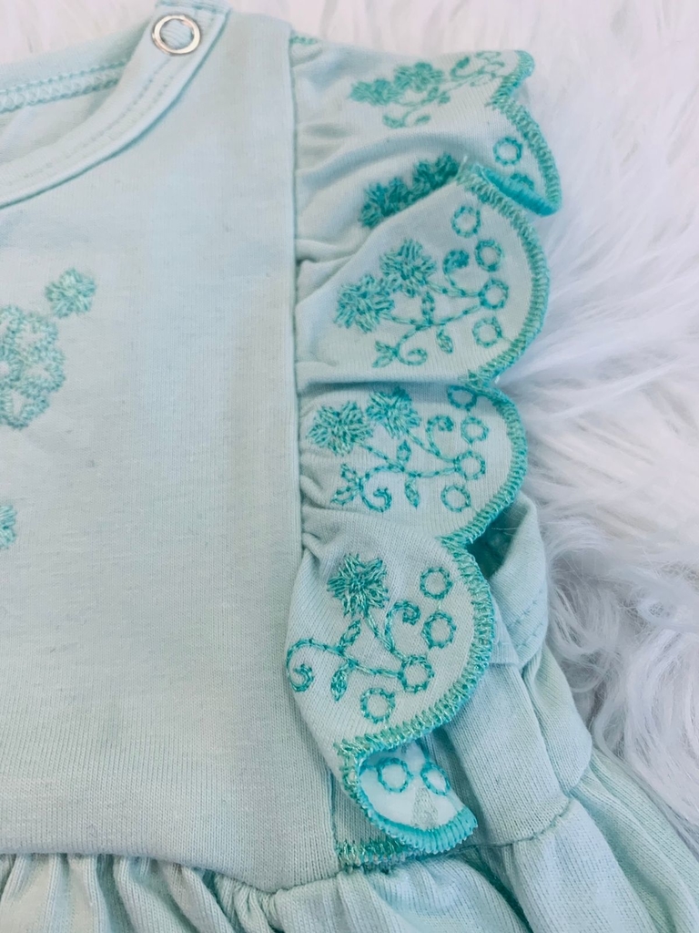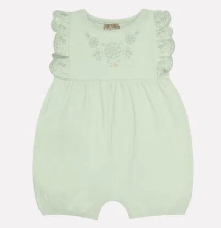 Esse lindo macaquinho de bebê é confeccionado em Cotton, na cor verde agua, possui babado nos ombros, acompanhando o delicado bordado frontal de flores, recorte franzido de pala e elástico confortável na perna, deixando a peça soltinha, e aberturas de ombro e entrepernas por botões de pressão.