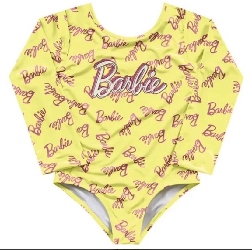 Maio manga longa moda praia Barbie confeccionado em tecido tratado com a tecnologia Sun Off UV, que confere fator de proteção UV (FPU) 50+ à peça para curtir um dia de praia com muito conforto e proteção. Modelo confeccionado em cotton na cor amarelo neon, manga longa, decote redondo, estampa rotativa com a a escrita Barbie e estampa localizada na parte superior com a escrita barbie, modelagem ajustada.
