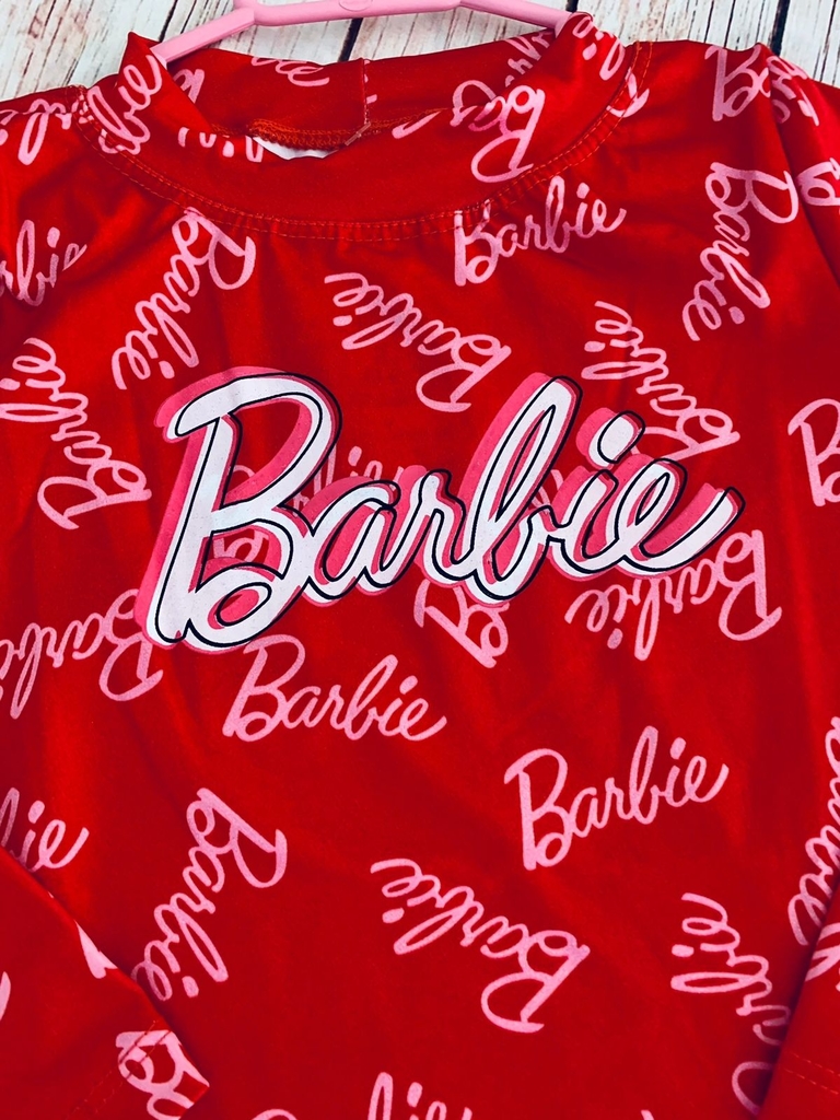 Camiseta manga longa confeccionada em tecido tratado com a tecnologia Sun Off UV, que confere fator de proteção UV (FPU) 50+ às peças, deixando o seu pequeno protegido dos raios solares e pronto para curtir um dia superdivertido na praia ou piscina. Camiseta com manga longa, decote redondo, cor vermelha, com estampa frontal com a escrita Barbie e estampa rotativas com a palavra Barbie, modelagem justa. O modelo é confeccionado em cotton poliéster 96% poliéster 4% elastano.