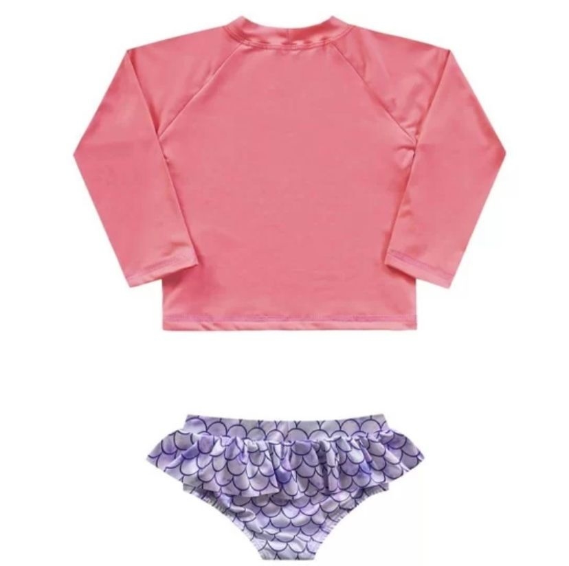 Esse lindo conjunto da Fakini é confeccionado em cotton poliéster com proteção solar fator 50 UV+, composto por duas peças: A camiseta na cor rosa neon possui gola redonda e mangas longas, com estampa frontal de gatinha sereia em um fundo lilás e costas lisa. Acompanha calcinha, confeccionada em cotton poliéster com forro em meia malha, com estampa de escamas de sereia e leve elástico em todas suas extremidades. Detalhe de babado próximo ao cós. Cor lilás. Tecido: Cotton poliéster. Forro: Meia malhaComposição: 96% Poliéster / 4% Elastano