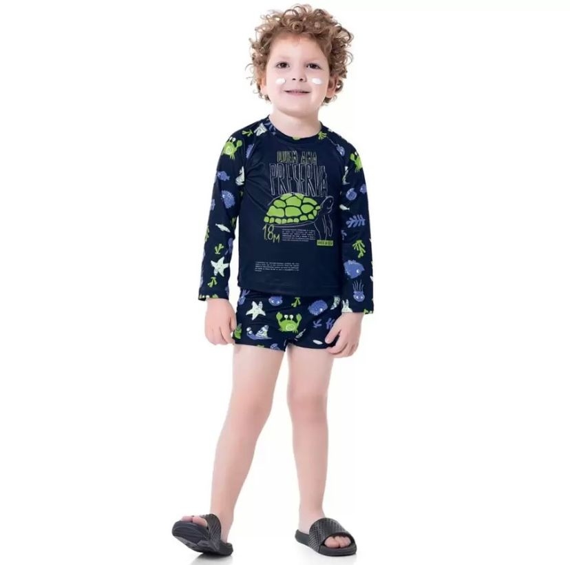 Conjunto camiseta manga longa e sunga Dinossauro para seu filho aproveitar na praia ou piscina com muito conforto e proteção UV (FPU) 50+. Modelo confeccionado em cotton preto, manga longa, decote redondo, estampa frontal com estampa de tarturuga com o lema preservação da natureza, estampa rotativa nas mangas e sunga de animais aquaticos do fundo do mar com fundo azul, cadarço interno, costura contraste, modelagem ajustada.