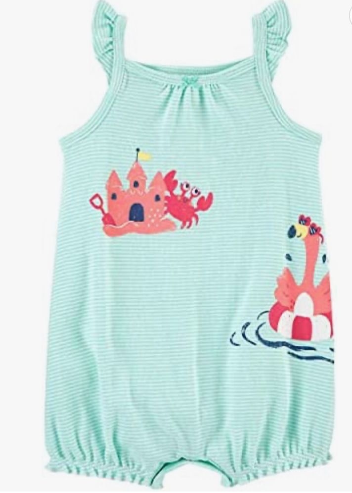 Nesta categoria você vai encontrar um Romper da Carter´s, de uma cor linda, listrado, de alcinha, com caranguejo, elastico nas pernas, e botão de pressão entre as pernas que facilitam a troca.
