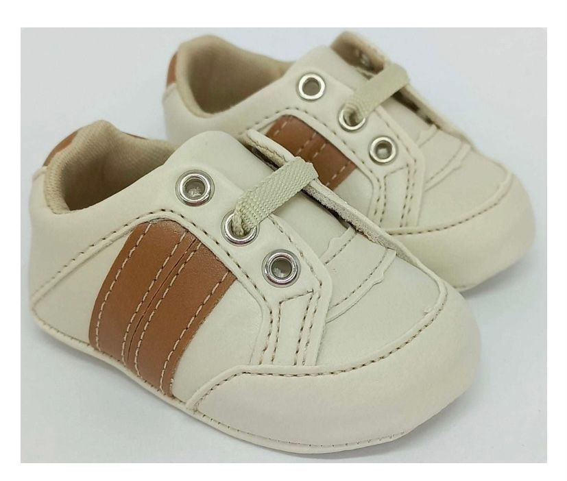 Aqui voce encontra um lindo tenis da linha baby, super confortável na cor bege, com cardaço da mesma cor, listras laterais na cor caramelo, detalhe no calcanhar em caramelo. Nos tamanhos 14 a 17 possui solados do próprio material do tenis sendo assim bem maleavel para o bebê. Já no tamanho 18, possui solado emborrachado, ideal para a criança dar os seus primeiros passos por ai.