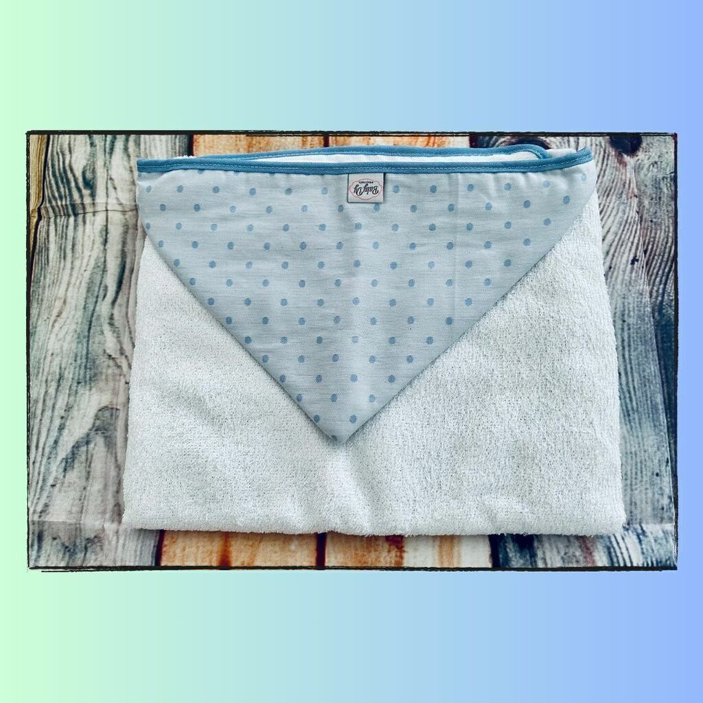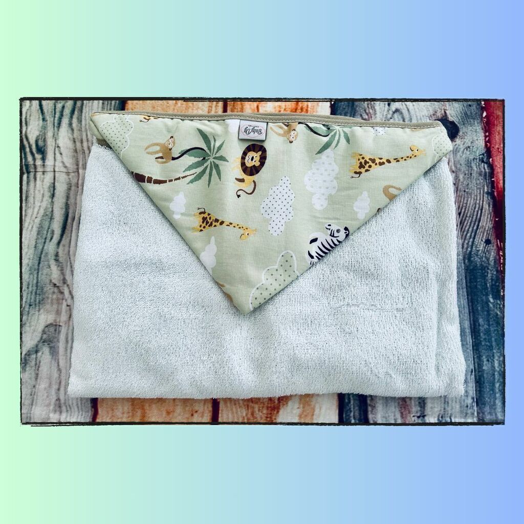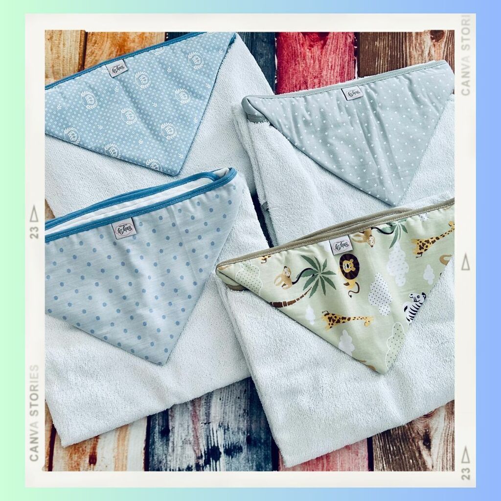 Aqui você encontra uma toalha dupla, super macia, com parte externa em tecido de toalha normal e a parte interna em fralda, ideal para o corpinho da criança. Possui capuz em tecido, também forrado, e com vies em toda a volta da toalha, o que da um acabamento impecável na peça.