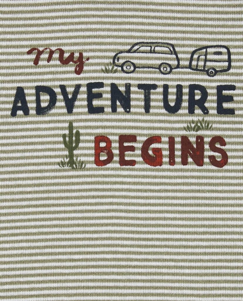 Este conjunto de 3 peças Carter´s contendo 1 body, 01 casaco e uma calça sendo: 01 body manga curta listrado com escrita Adventure, 01 casaco com botões em madeira com capuz e uma calça lisa da mesma cor do capuz.