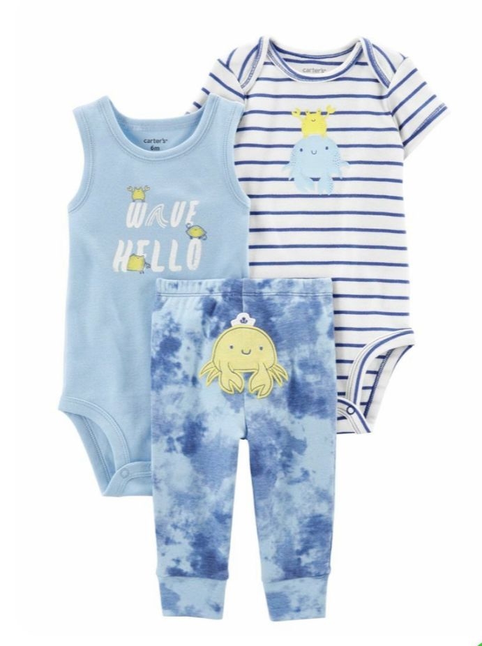 Este conjunto de 3 peças Carter´s contendo 2 body e 01 calça sendo: 01 body regata azul regata com estampa frontal de caranguejo, 01 body manga curta listrado com bordado frontal de caranguejo e uma calça com estampa tieday e caranguejo bordado atras.