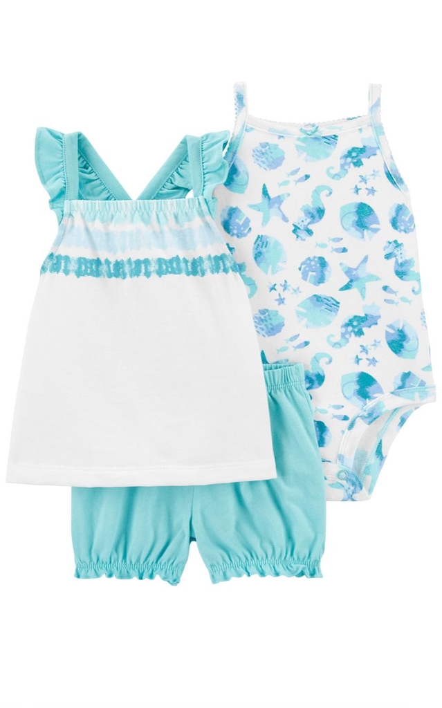 Este conjunto de 3 peças Carter´s contendo 1 body, 01 blusa e um short sendo: 01 body manga de alcinha branco com estampa de cavalo marinho e fundo do mar, 01 short liso na cor verde do mesmo tom da estampa do body e detelhe e alças da blusa, e uma blusinha regata na cor branca com detelhes na parte superior frontal no mesmo tom da estampa do body.