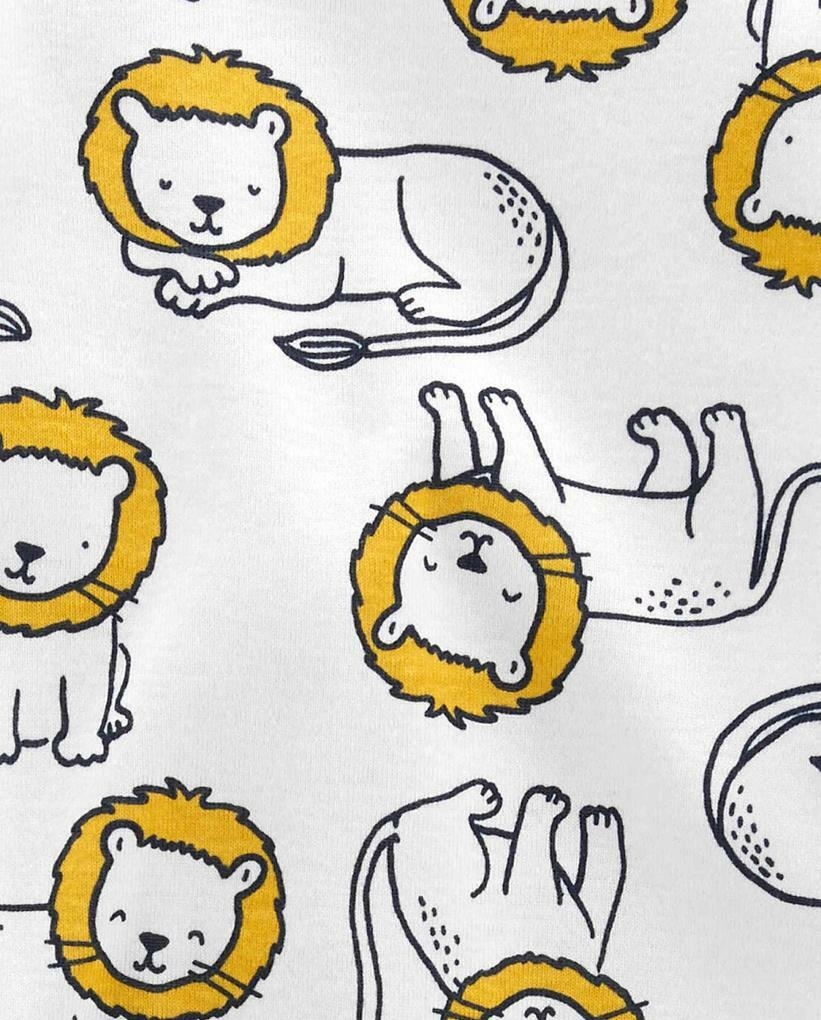 Este conjunto de 3 peças Carter´s contendo 1 body manga longa, 1 body manga curta e 01 calça sendo: 01 body manga longa branco com estampa rotativa de leão, 01 body manga curta mostarda com estampa frontal em relevo de leão e uma calça azul marinho com bordado na bunda de leão.
