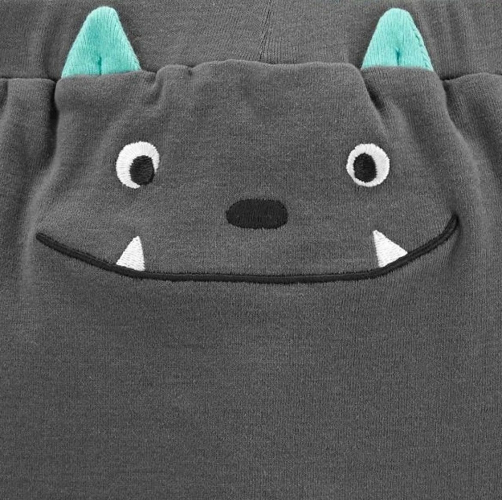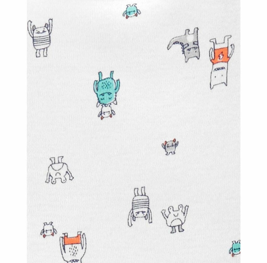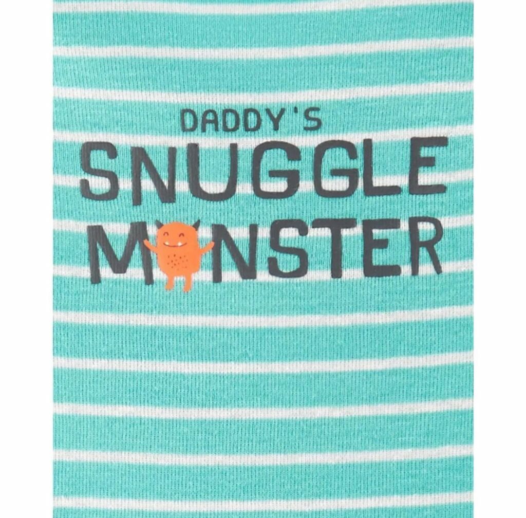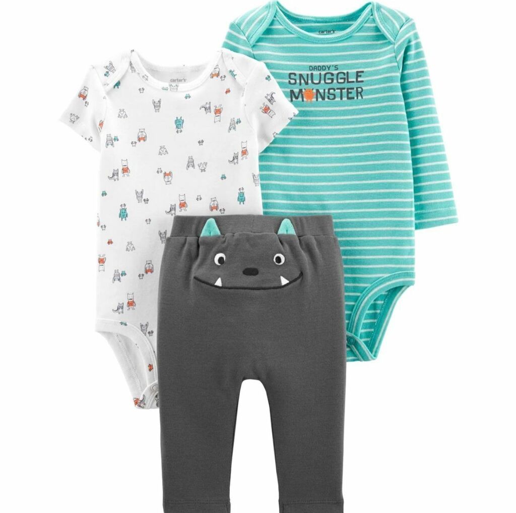 Este conjunto de 3 peças Carter´s contendo 1 body manga longa verde listrado com escrita na parte frontal, 01 body manga cura com estampa rotativa de monstrinhos e uma calaça com orelhas e bordado de carinhana parte das costas.