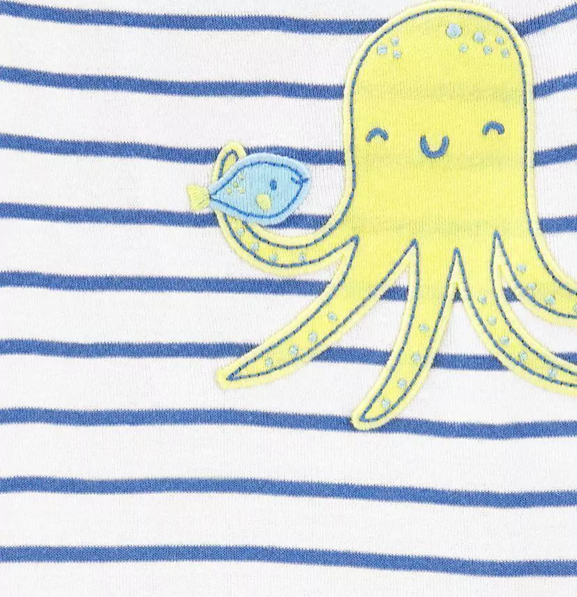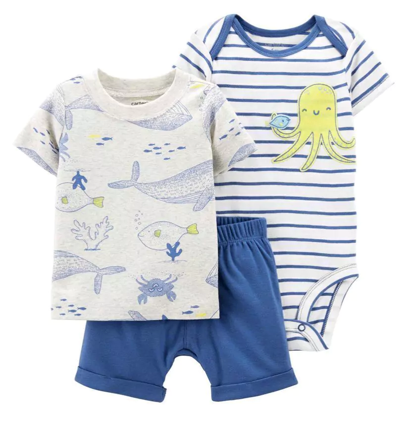 Este conjunto de 3 peças Carter´s contendo 1 body, 01 camiseta e um short sendo: 01 body manga curta listrado com bordado de polvo, 01 camiseta com estampa rotativa de animais marinhos e um short azul estiloso com botões frontais.