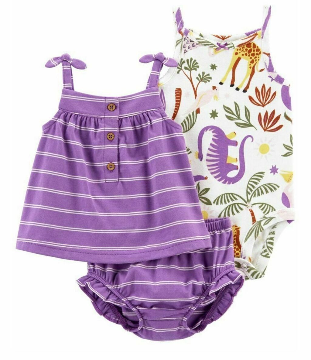 Este conjunto de 3 peças Carter´s contendo 1 blusa, 1 short e um body sendo: 01 blusa estilo batinha de alça, com botões frontais na cor roxa com listras, um body de alça estampado de animais com toques de roxo e um short roxo com listras e babados nas pernas o que da um charme ao modelo.