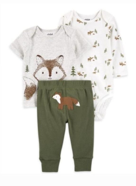 Este conjunto de 3 peças Carter´s contendo 1 body, 1 camiseta e 01 calça sendo: 01 body manga longa branco com estampa rotativa de raposa, 01 camiseta manga curta cinza mescla com estampa frontal de raposa e uma calça verde militar com bordado na bunda de rapos