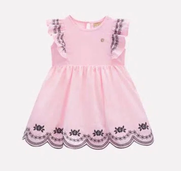 Vestido Infantil Milon confeccionado em Tricoline acetinado, possui recorte franzido na cintura, bordado em cor contrastantes, barrado diferenciado e babados nos ombros. Conta também com forro com tule para deixar rodado e abertura em gota no decote das costas, com fechamento por botão.